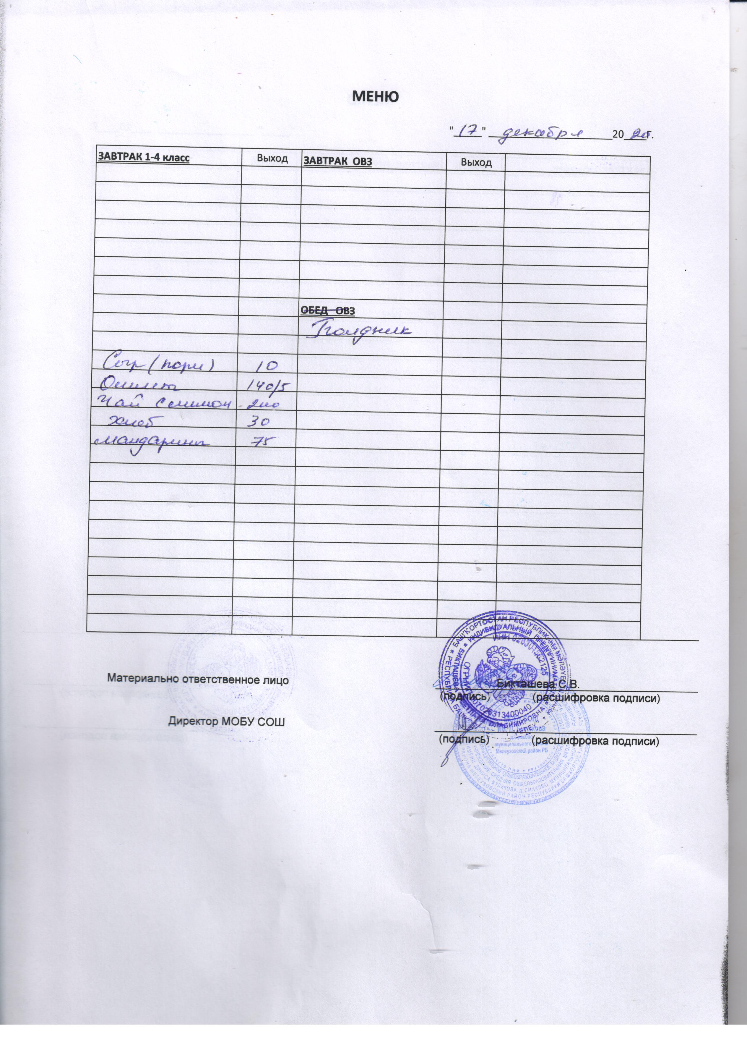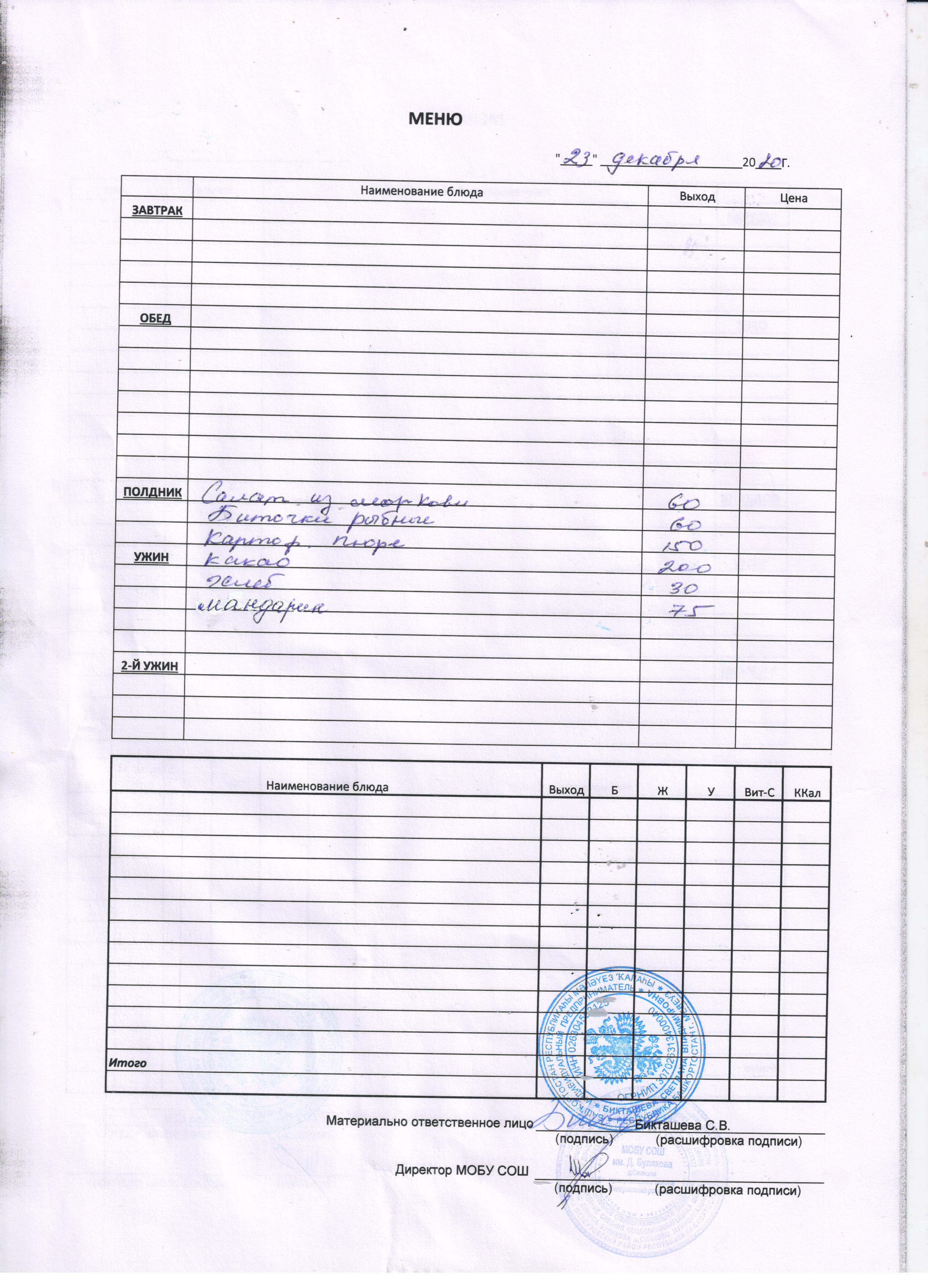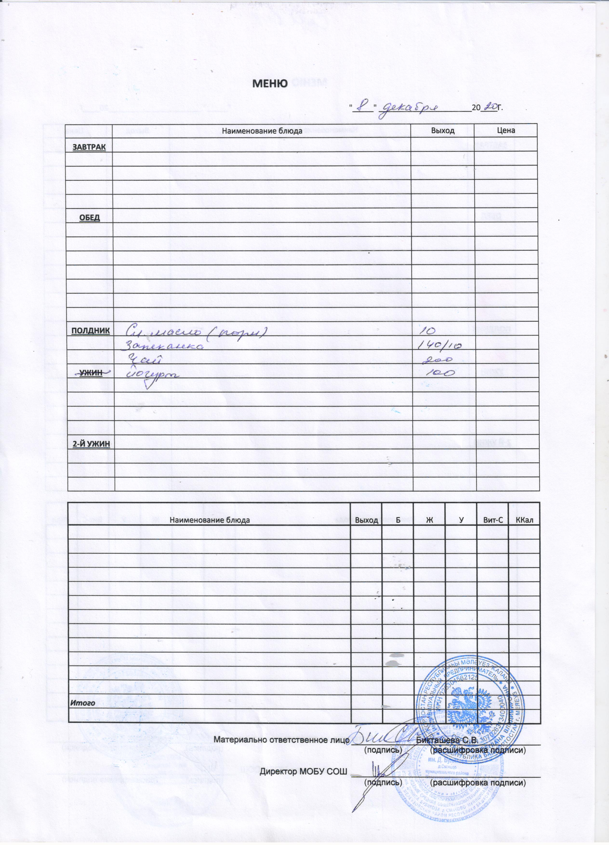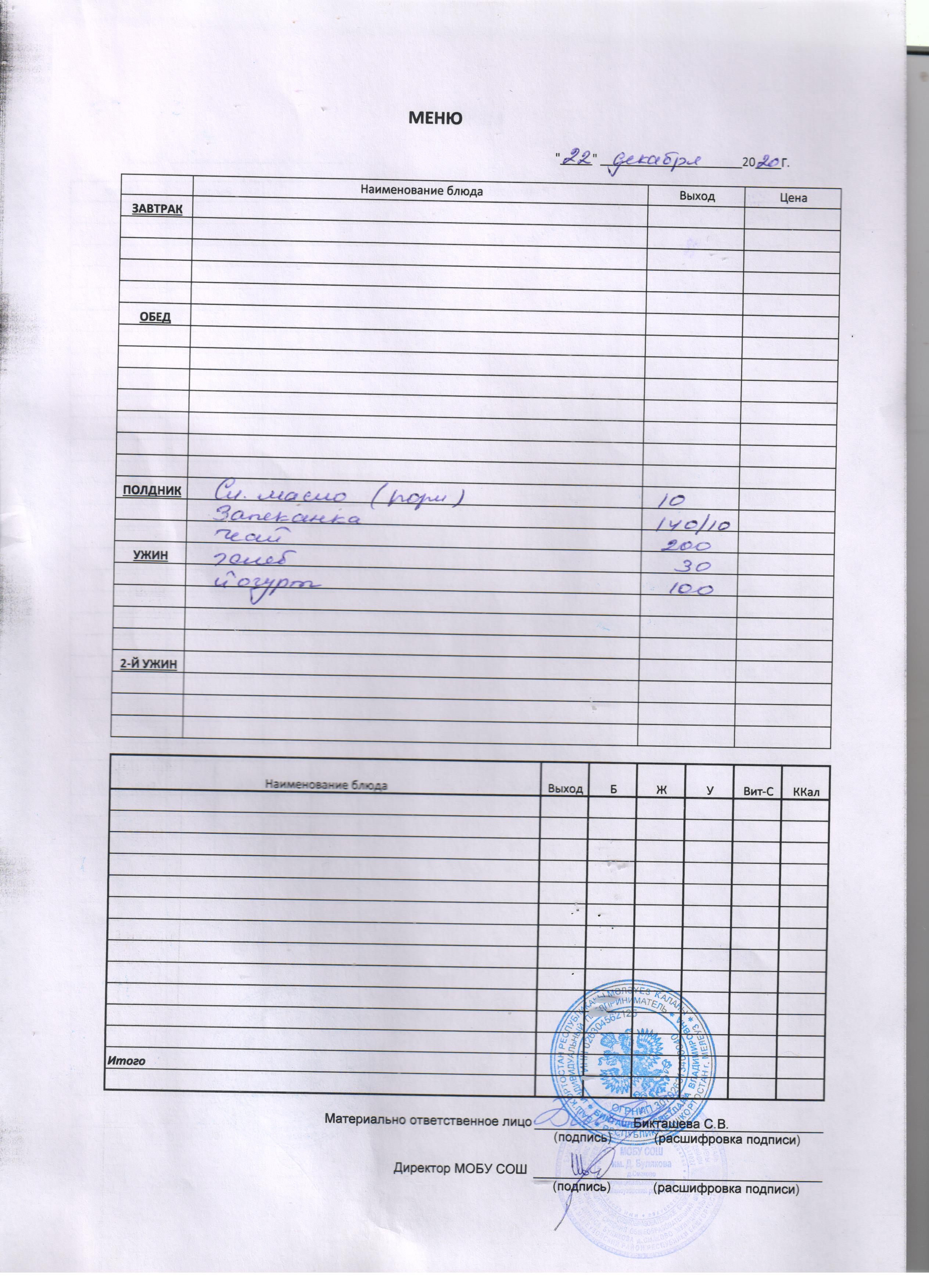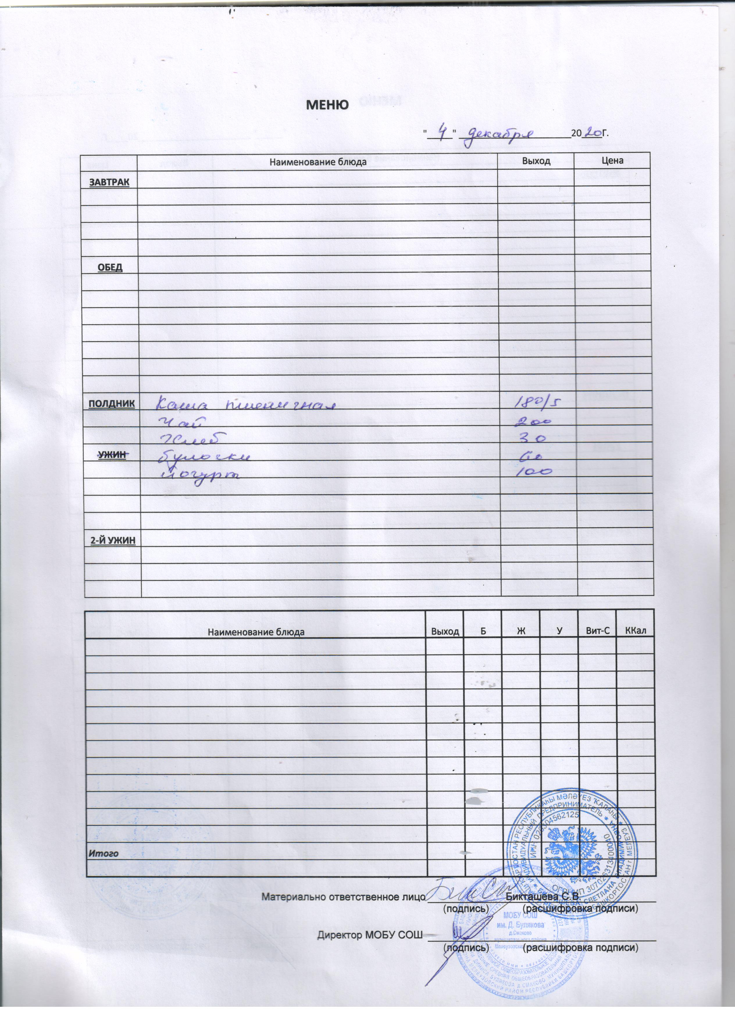 ИП «Бикташева» обеспечивает качественным питанием с разнообразным меню учащихся МОБУ СОШ им.Д.Булякова д.Смаково по дням недели, согласно санитарно-эпидемиологическим требованиям к организации питания учащихся (СанПин 2.4.52409-08), несет полную ответственность за качество приготовления пищи. При оказании услуг, с учетом возраста учащихся, соблюдаются требования настоящих санитарных правил по массе порций блюд, пищевой и энергетической ценности, суточной потребности в основных витаминах и микроэлементах.