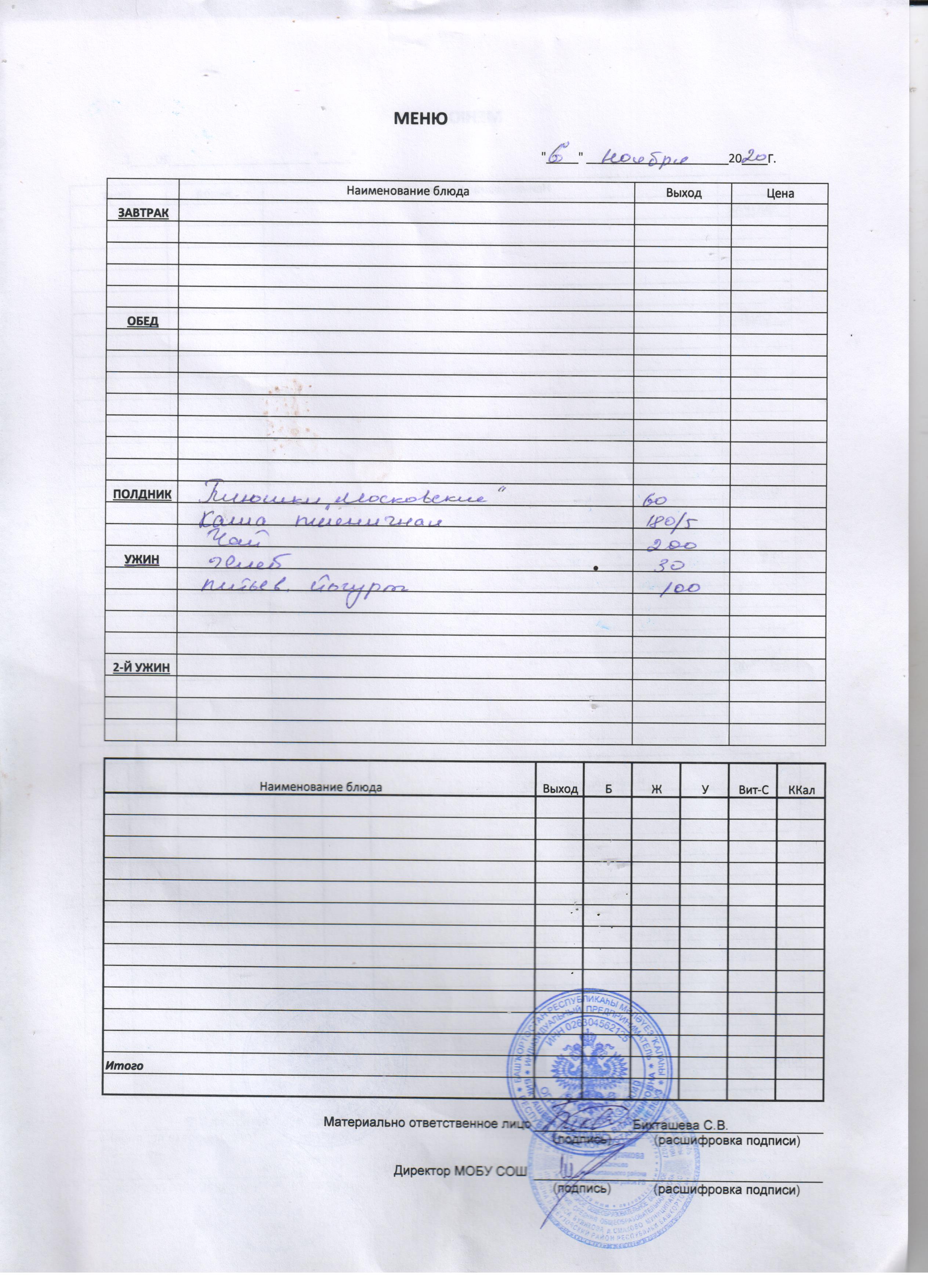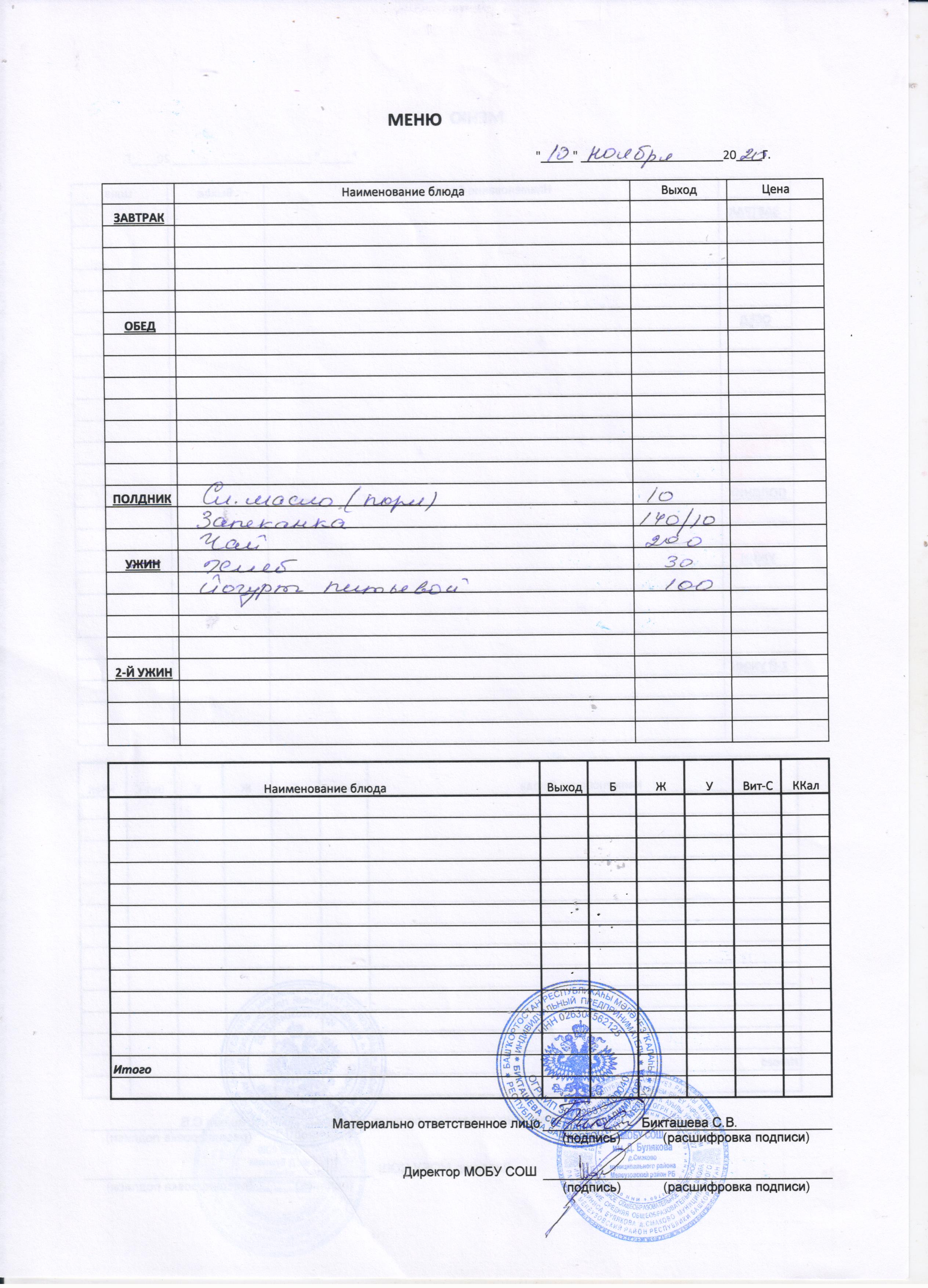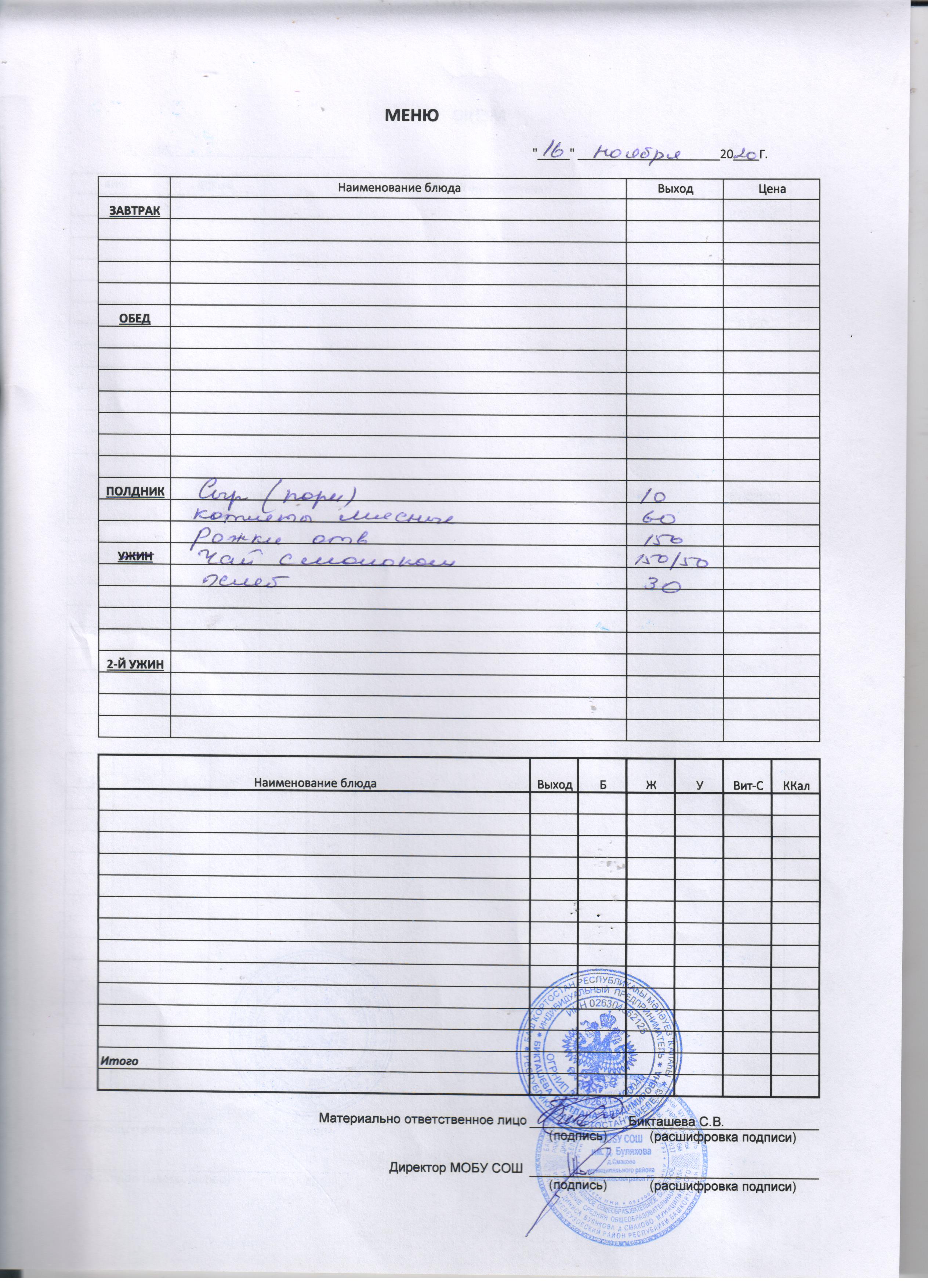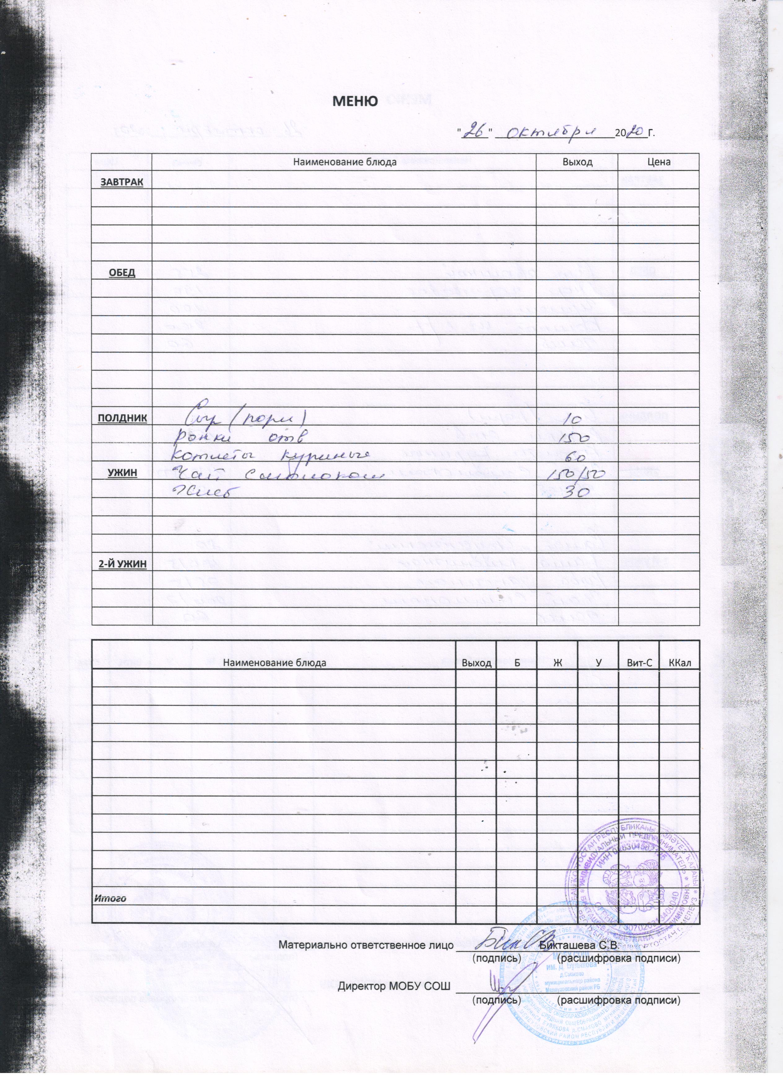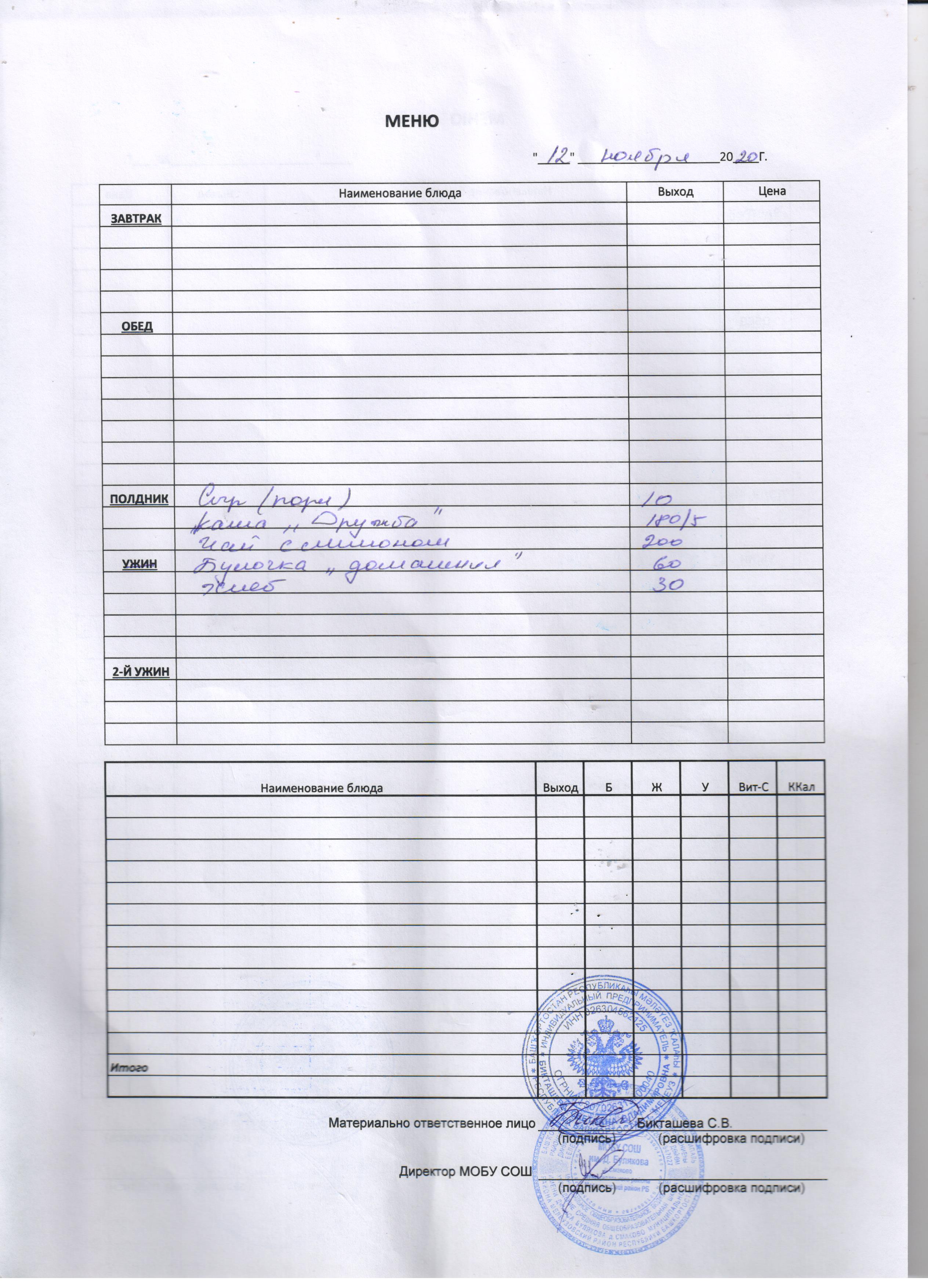 ИП «Бикташева» обеспечивает качественным питанием с разнообразным меню учащихся МОБУ СОШ им.Д.Булякова д.Смаково по дням недели, согласно санитарно-эпидемиологическим требованиям к организации питания учащихся (СанПин 2.4.52409-08), несет полную ответственность за качество приготовления пищи. При оказании услуг, с учетом возраста учащихся, соблюдаются требования настоящих санитарных правил по массе порций блюд, пищевой и энергетической ценности, суточной потребности в основных витаминах и микроэлементах.